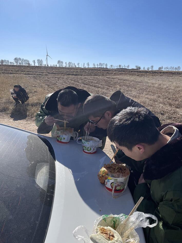 在風場值班時,一日三餐只能是泡面、自熱米飯這類速食品。為方便下班的同事吃飯、保證飲食安全,大家在住宿賓館附近選擇一家小餐館,作為值班回來就餐的“定點食堂”。接上完成交接班的同事們,我們一起去體驗了“食堂”。晚餐過程中,大家說說笑笑,精神狀態很不錯,完全看不出已經在風場風餐露宿了兩周多時間。